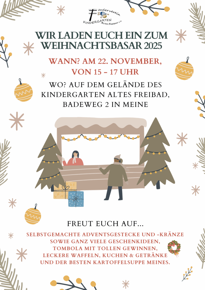 Am 20.11.21 sollte der Weihnachtsbasar nach einem Jahr Pause auf dem Gelände der KiTa „Altes Freibad“ in Meine wieder stattfinden. Der ursprüngliche Plan sah vor, dass unter 3G Richtlinien Adventsdekoration, Waffeln, Bratwurst und Kinderpunsch angeboten werden sollte. Auch eine große Tombola war geplant. Einen Tag vor Durchführung entschied sich der Förderverein allerdings, von der Veranstaltung abzusehen. Grund dafür waren die immer stärker ansteigenden Corona-Fälle.